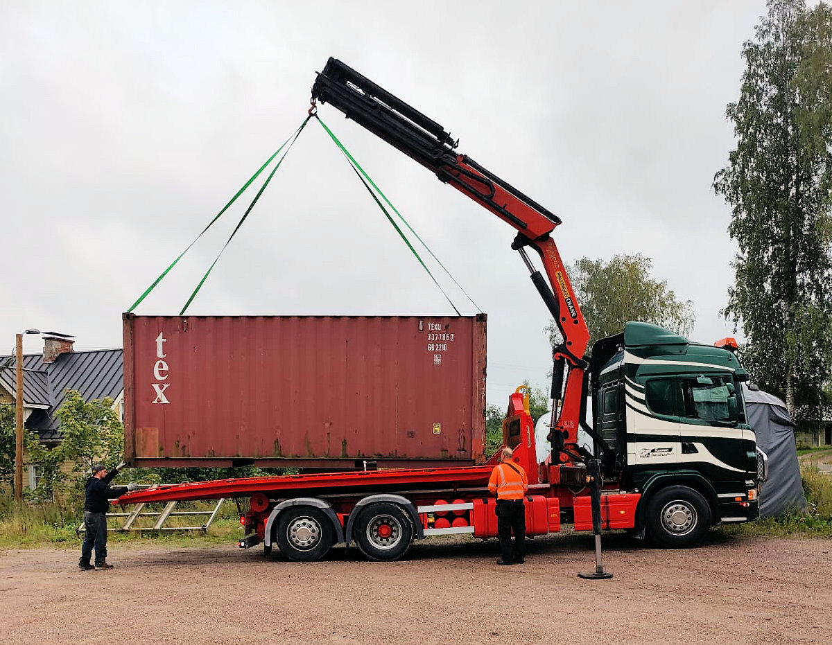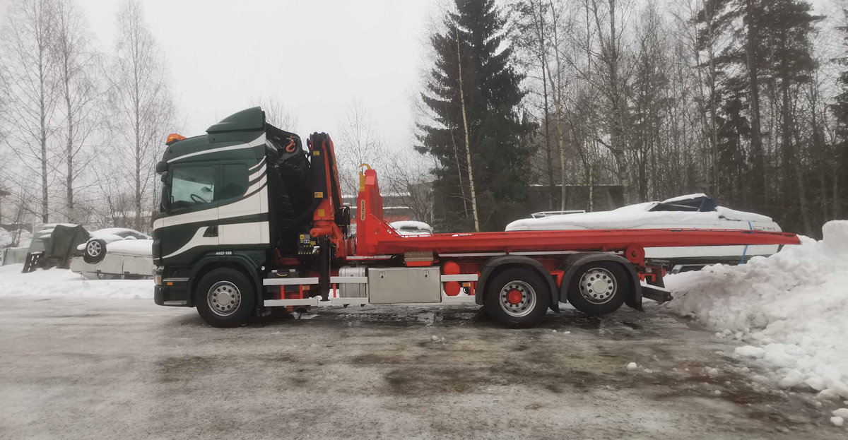 Tarjoamme nouto-, kuljetus- ja nostopalveluita Scania G480 vaihtolava-autolla, jossa on Palfinger Pk 23002 nostolaite.